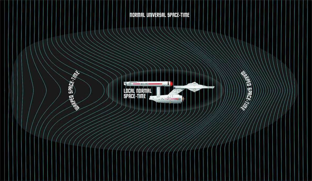 Partendo da soluzioni per metriche della relatività generale (Einstein), nel 1994 un fisico teorico, il messicano Miguel Alcubierre, elaborò le basi matematiche per una vera e propria “propulsione a curvatura” che NON avrebbe interferito, per l’appunto, con la relatività generale. Nota bene: Alcubierre si interessò ad metodo di viaggio interstellare dopo averlo visto Star Trek, cercando di trovare applicabilità nella scienza di quanto prodotto dalla fantascienza: riuscendoci! Il modo in cui funziona un cosiddetto “warp-drive” (guida con motore a curvatura) è essenzialmente quello di espandere e contrarre il tessuto spaziotemporale attorno a una nave spaziale, che può essere vista come immersa in una “bolla” (campo di forze): la nave NON accelera NE’ si muove ma è il tessuto spaziotemporale che la circonda a muoverla a seguito di tali contrazioni/espansioni previste dalla relatività (per analogia, è come se la nave spaziale fosse posta su una sorta di nastro trasportatore, senza muoversi).