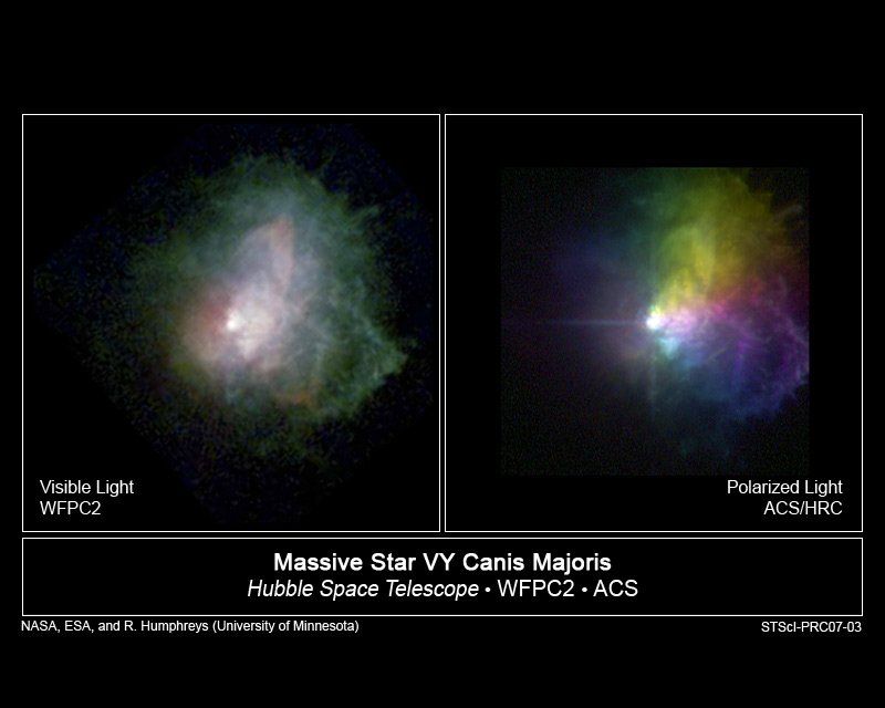 Nell’angolo sud-orientale di Canis Major, non lontana dal bell’ammasso stellare NGC2362, è presente un’anonima stella di ottava grandezza che, osservata già con al binocolo, evidenzia una spiccata colorazione rossastra; si tratta di VY Canis Majoris (abbreviato in VY CMa), il cui nome forse risuonerà nella memoria di chi legge in quanto tale astro, lontano 4.000 anni-luce dal Sistema Solare, è stato a lungo considerato quale la più grande stella nota nella Galassia. Le più recenti stime determinano il raggio di VY CMa in circa 1.420 volte quello del Sole da cui deriva un volume quasi 8 miliardi di volte quello della nostra stella!