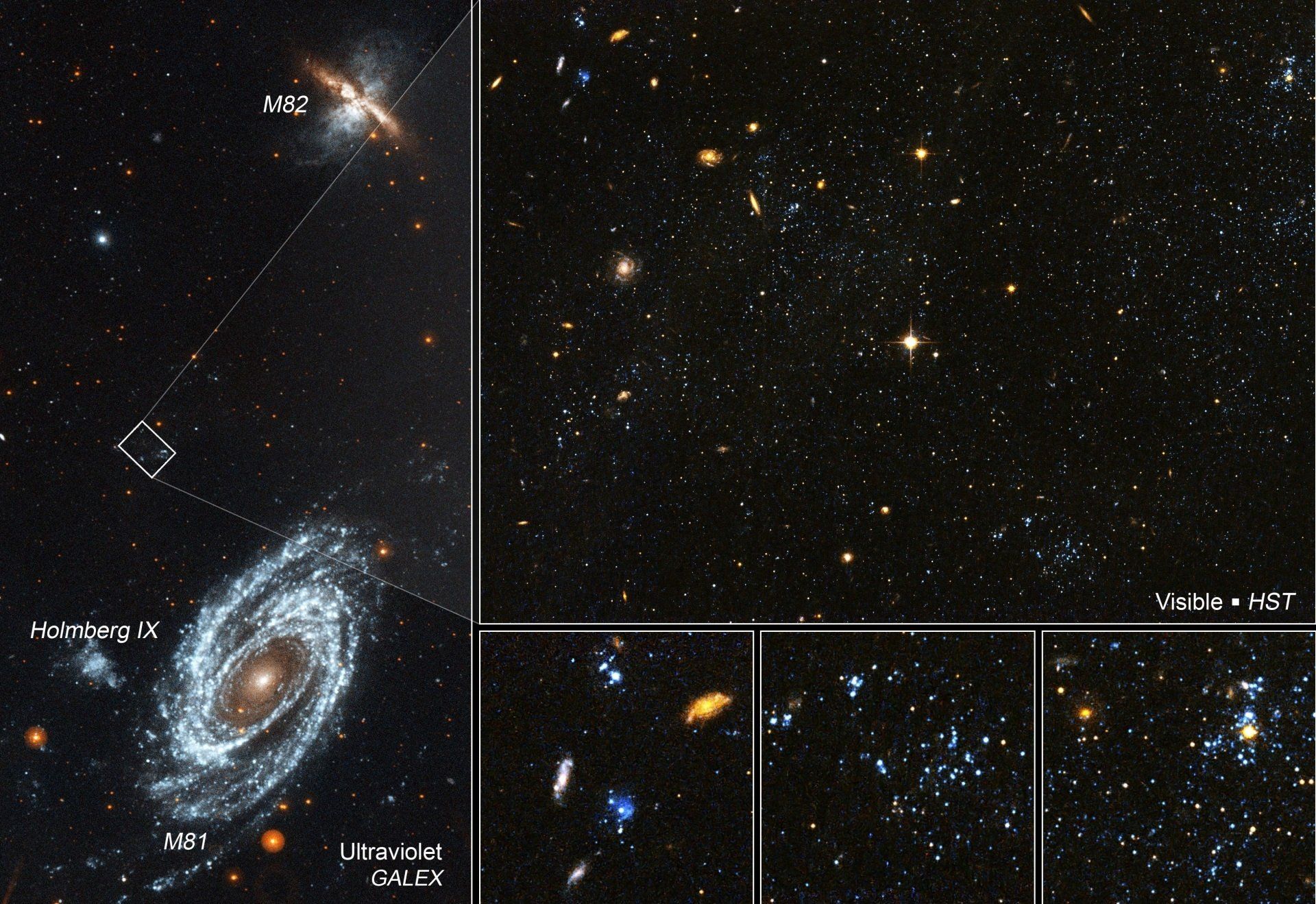 Parlavamo ieri, in questa pagina, della galassia Holmberg IX, vicina della nota M81 (uno dei target preferiti in questo periodo dell'anno da parte degli astofotografi) e di come la sua stessa struttura sia causa diretta dei passaggi ravvicinati avuti con la sua sorella maggiore e, forse, anche con la vicina M82.