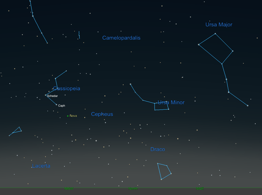 Immagine sotto: posizione indicativa della nuova "nova" in Cassiopeia (Image credits: Alison Klesman, via TheSkyX)