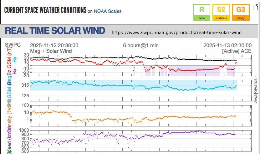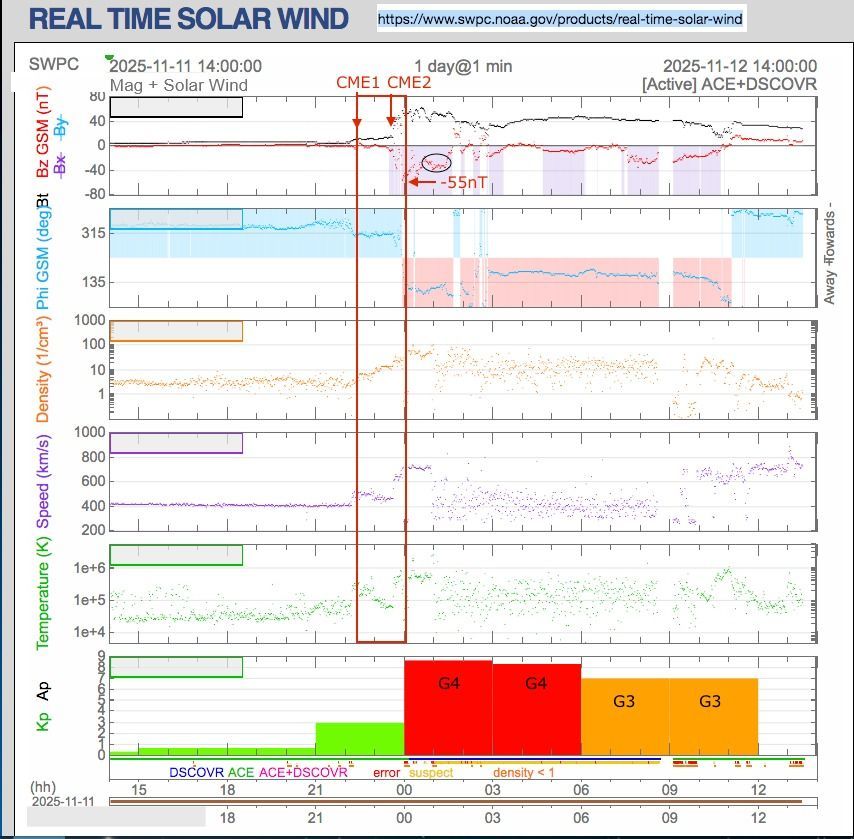 Questo, dopo 40' di viaggio finale della CME da L1 a Terra, all'1:40 UT ovvero le 2:40 locali, ha disturbato la magnetosfera terrestre innescando il picco di tempesta geomagnetica G4. Il valore in realtà sarebbe G4.7, come in Ottobre 2024, anche se la convenzione per la scala G è di arrotondare per difetto a G4 o, volendo, di scrivere G5-.