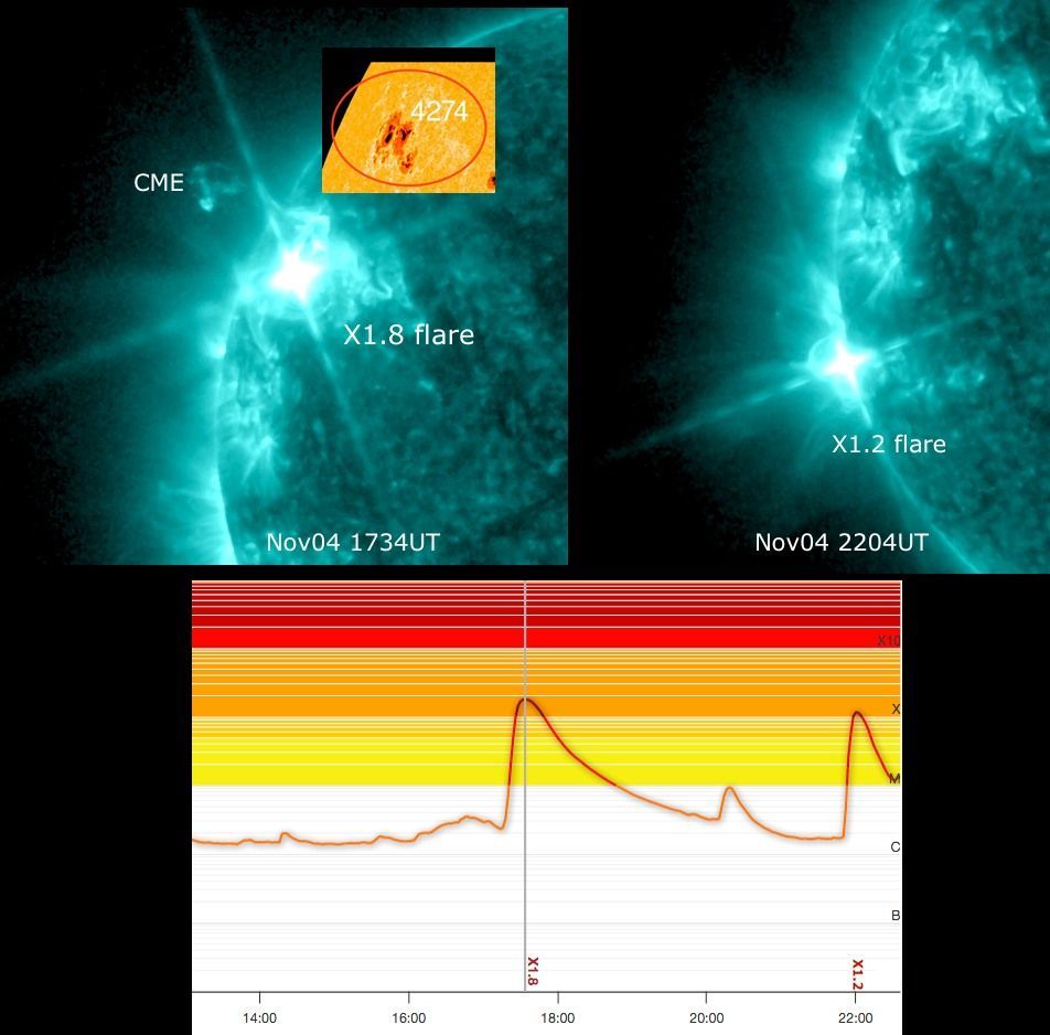 Un Novembre attivo. La regione attiva (gruppo di macchie solari) 4274 nell'emisfero Nord continua a dare spettacolo. Quello di oggi è il suo quinto brillamento di classe X (la più intensa).