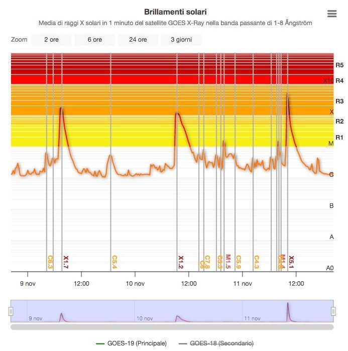 SOLE E AURORA BOREALE - BRILLAMENTO X5 OGGI (IL PIU' INTENSO DAL 2024), X1 IERI, X2 L'ALTRO IERI - PREVISTA TEMPESTA GEOMAGNETICA G4 PER STANOTTE E DOMANI NOTTE: il più intenso brillamento solare dell'anno (finora) è avvenuto stamane, nell'emisfero Nord, con picco X5 circa alle 10UT. Ricordiamo che per i brillamenti solari le lettere X, M, C (i cui significati si possono ricordare con eXtra, Medium, Common) indicano potenze di 10, quindi quello di oggi è un brillamento con ordine di grandezza 100x più intenso di un comune C. Il livello misura l'intensità della luce in una certa banda di raggi X.