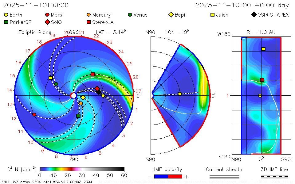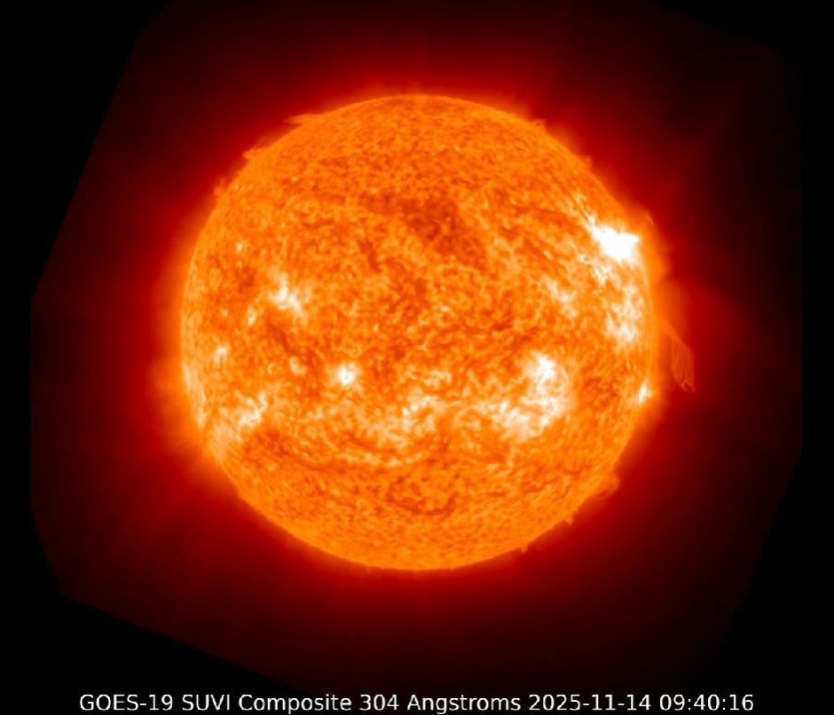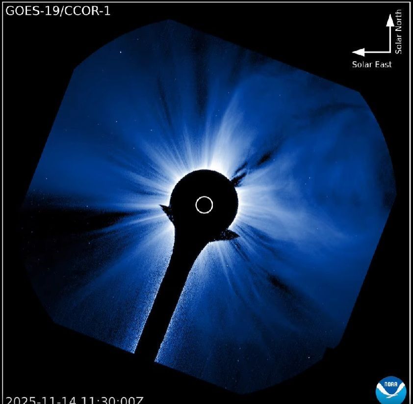 Ricordiamo che, mentre nel 2024 l'attività è stata dominata un massimo nell'emisfero Sud (probabilmente il massimo assoluto del corrente ciclo undecennale), nel 2025 quasi tutti i brillamenti X sono provenuti dall'emisfero Nord. Questa attività nell'emisfero Nord ha avuto (finora) il massimo nella prima metà di Novembre, dominata dalla regione 4274, che è stata responsabile di 4 brillamenti X associati ad altrettante CME (due delle quali, sommandosi, hanno causato la tempesta geomagnetica G5- dell'11 Novembre, con aurora boreale rossa vista a occhio nudo anche in Norditalia e Slovenia nonostante il chiaro di Luna). Se la regione esiste ancora, dovrebbe tornare sulla faccia fra uno o due giorni, ed è probabile dato che una CME è stata prodotta dal luogo dove dovrebbe essere la regione.
