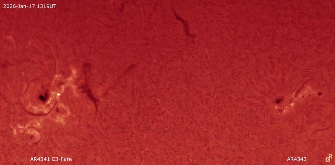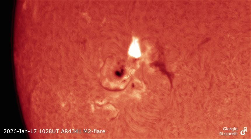 Le immagini in rosso, realizzate da me in cromosfera il giorno precedente, mostrano la regione interessata con un brillamento M (medio) e uno comune (C).