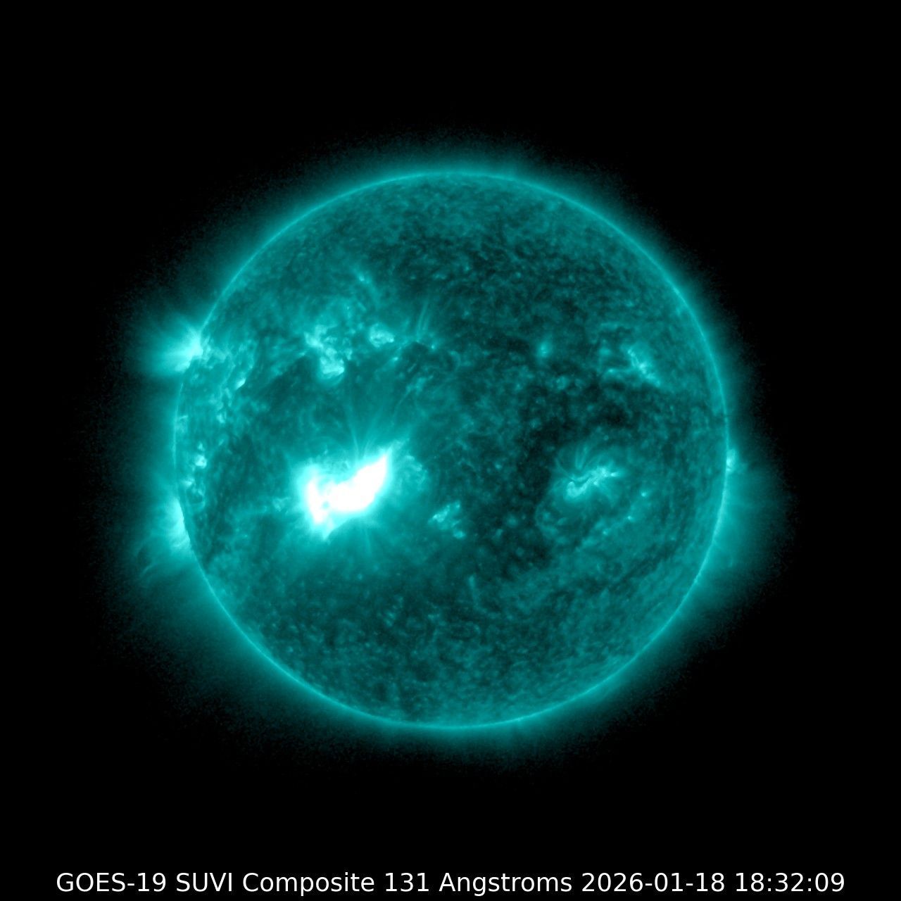 Le prime tre immagini/timelapse allegate sono state acquisite in UV estremi a varie lunghezze d'onda (rappresentate da falsi colori) da un satellite geostazionario del NOAA. Il brillamento di luce di oggi, dopo il picco iniziale avvenuto attorno alle 18UT (particolarmente visibile nel canale "turchese"), sta durando varie ore ed è associato a una CME, cioè un'eruzione nella corona solare e diretta verso lo spazio, visibile nel canale "oro".