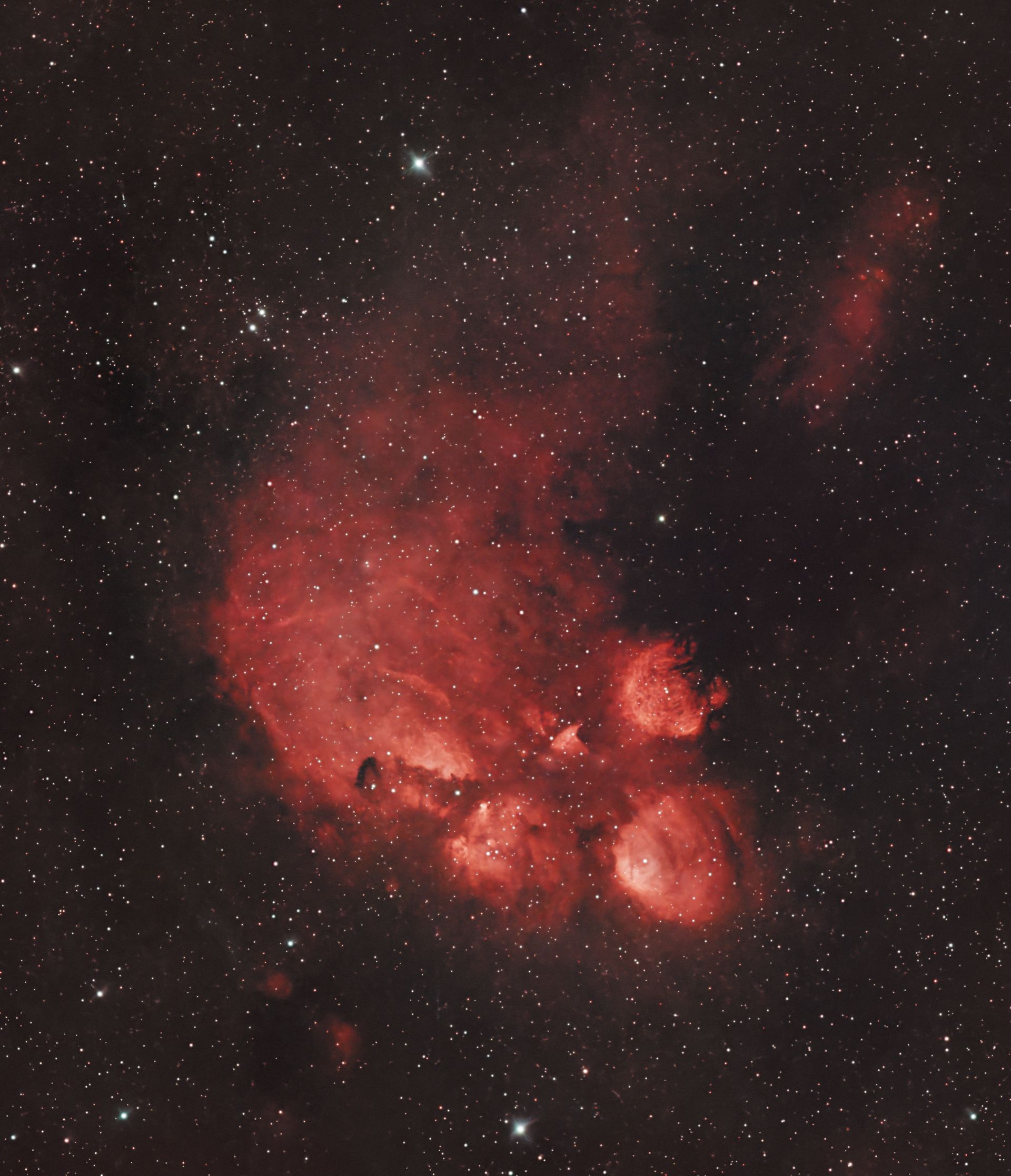 L'uso del filtro H-alpha (656 nm) evidenzia la presenza dell'idrogeno le numerose aree nebulari di formazione stellare sparse nei bracci a spirale. Tra queste, risalta l'immensa NGC604 (visibile come una macchia rossastra intensa in alto a sinistra della regione centrale), che è una delle regioni H II giganti meglio studiate. Con un diametro stimato di circa 1.500 anni-luce e un raggio di 760 anni-luce, NGC604 è effettivamente considerata la più vasta e luminosa regione H II dell'intero Gruppo Locale. Questa fucina cosmica ospita un gran numero di stelle calde e massicce.