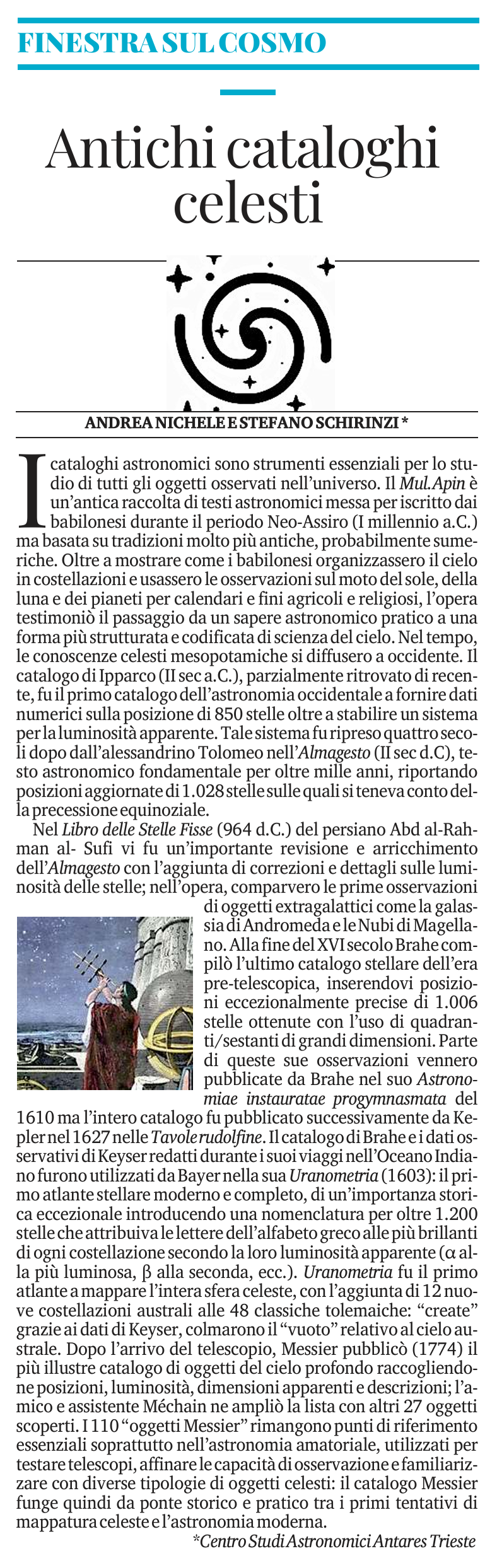 FINESTRA SUL COSMO: nell'odierna puntata della rubrica pubblicata sullo storico quotidiano Il Piccolo di Trieste, gli autori Andrea Nichele e Stefano Schirinzi (Centro Studi Astronomici Antares Trieste) espongono l'evoluzione storica dei cosiddetti "cataloghi astronomici", elenchi ordinati di oggetti che vanno dai corpi del Sistema Solare agli esopianeti, dalle stelle a macrostrutture come gli ammassi e i superammassi di galassie. Descrivendo i cataloghi redatti all'antichità fino al noto Messier, primo importante catalogo compilato nell'era telescopica, viene descritta la grande importanza dei cataloghi celesti nella storia: mappando gli oggetti astronomici stagliati sulla volta celeste, essi hanno infatti rivestito un ruolo di primaria importanza nella comprensione scientifica dell’Universo.