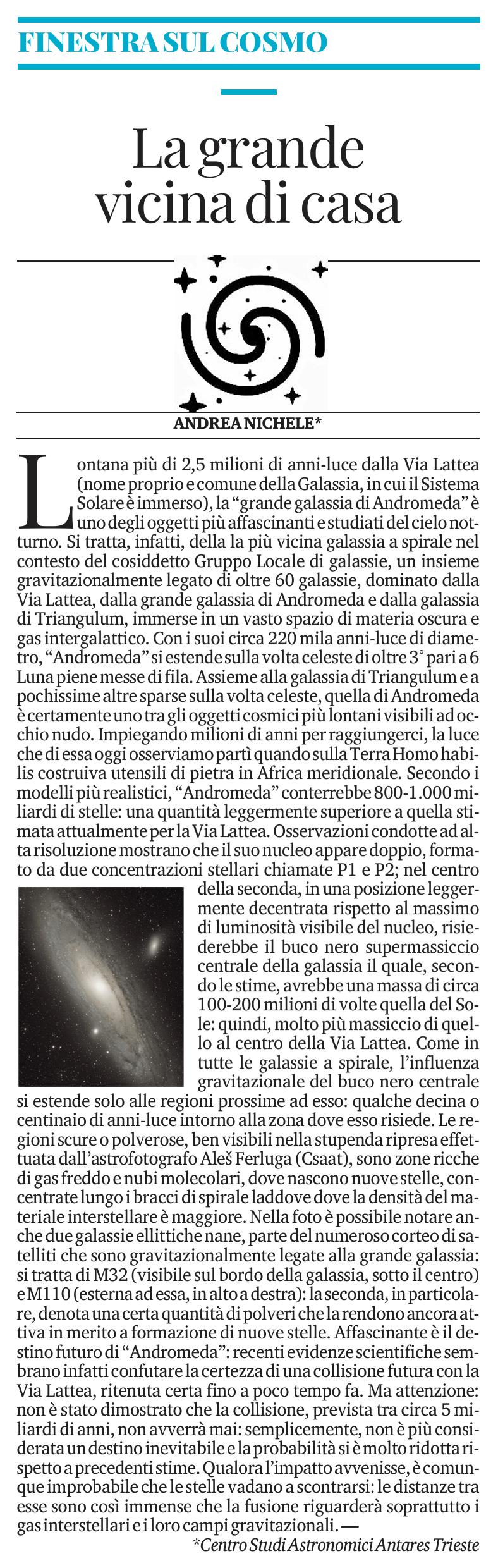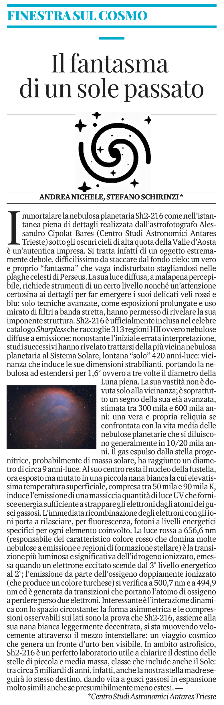 FINESTRA SUL COSMO: in questa nuova puntata della rubrica pubblicata dallo storico quotidiano Il Piccolo, un approfondimento a firma Andrea Nichele e Stefano Schirinzi (Centro Studi Astronomici Antares Trieste) sulla natura, le dimensioni e l'importanza in ambito di evoluzione stellare dell'affascinante e sfuggente relitto che è Sh2-216 in Perseus: la nebulosa planetaria più vicina al Sistema Solare e la più estesa sulla volta celeste, visibile con incredibili dettagli e colori nella stupenda foto realizzata dall'astrofotografo Alessandro Cipolat Bares (Centro Studi Astronomici Antares Trieste) dai cieli della Valle d'Aosta.