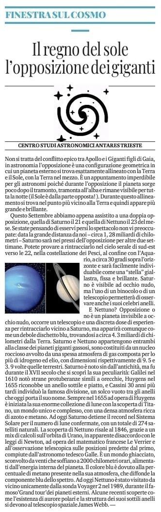 FINESTRA SUL COSMO: in questo periodo, I due pianeti giganti Saturno e Nettuno si trovano apparentemente vicini sulla volta celeste e in opposizione al Sole, rendendosi visibili per tutta la notte. In questo nuovo numero della rubrica pubblicata su Il Piccolo, Alessandro Albanese (Centro Studi Astronomici Antares Trieste) approfondisce su questa particolare congiunzione assieme alle caratteristiche salienti del "signore degli anelli" e di quello che ad oggi è il più lontano pianeta noto del regno del Sole.