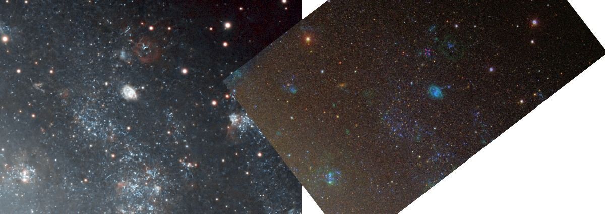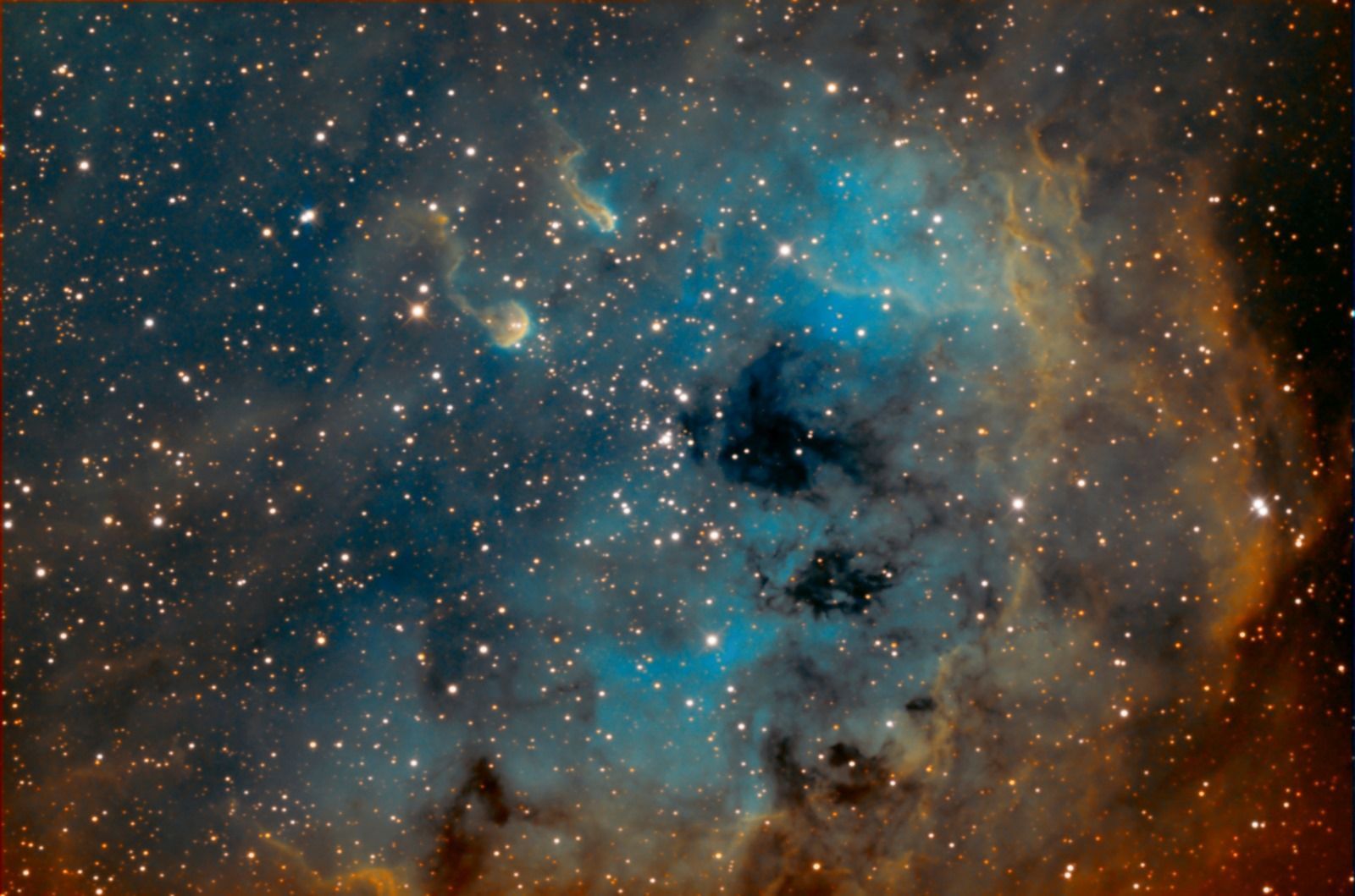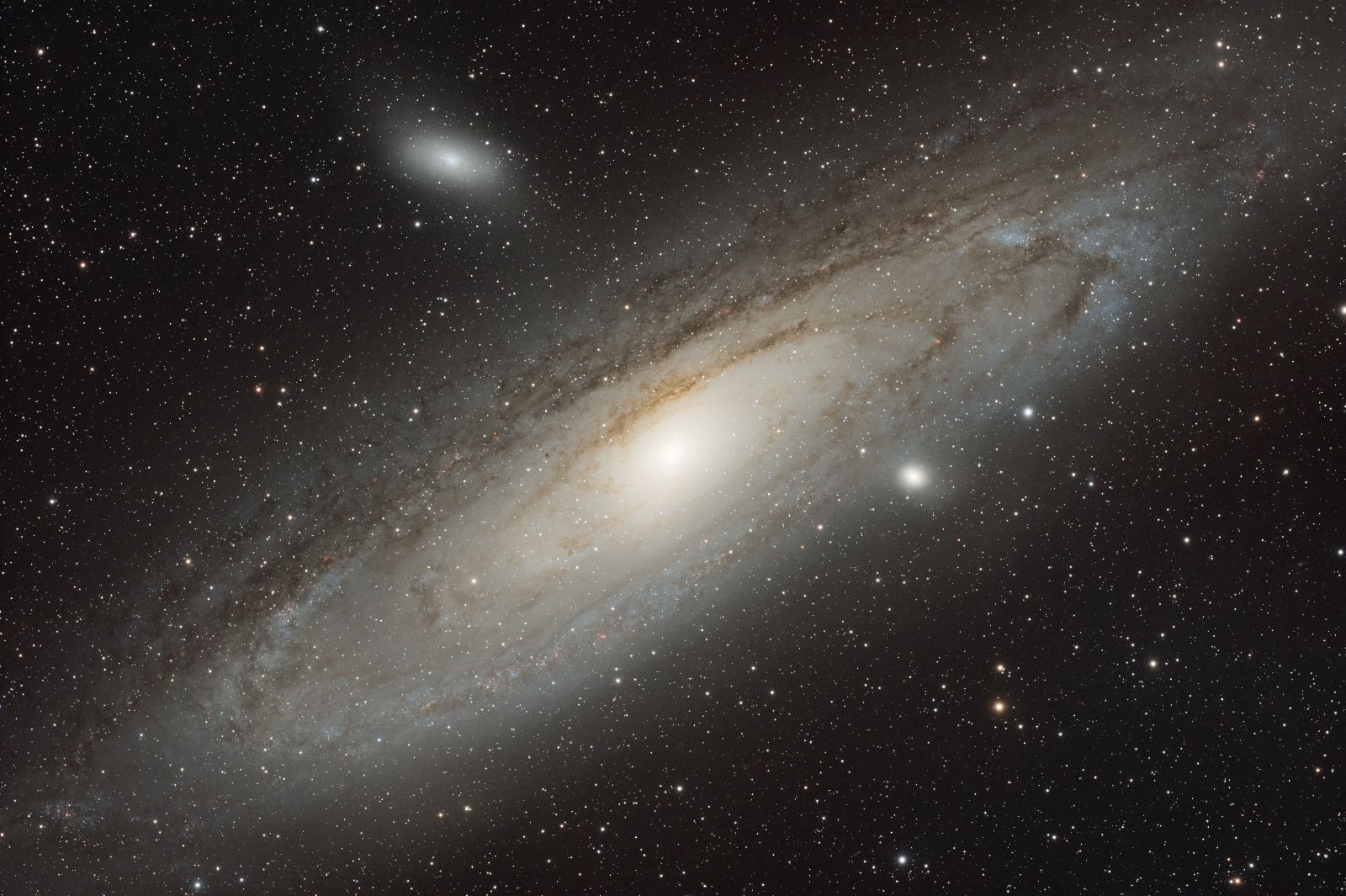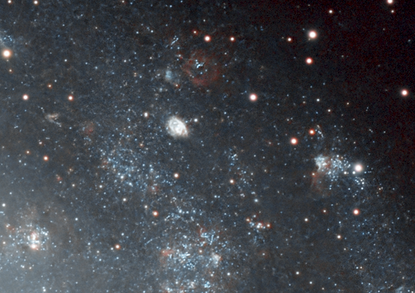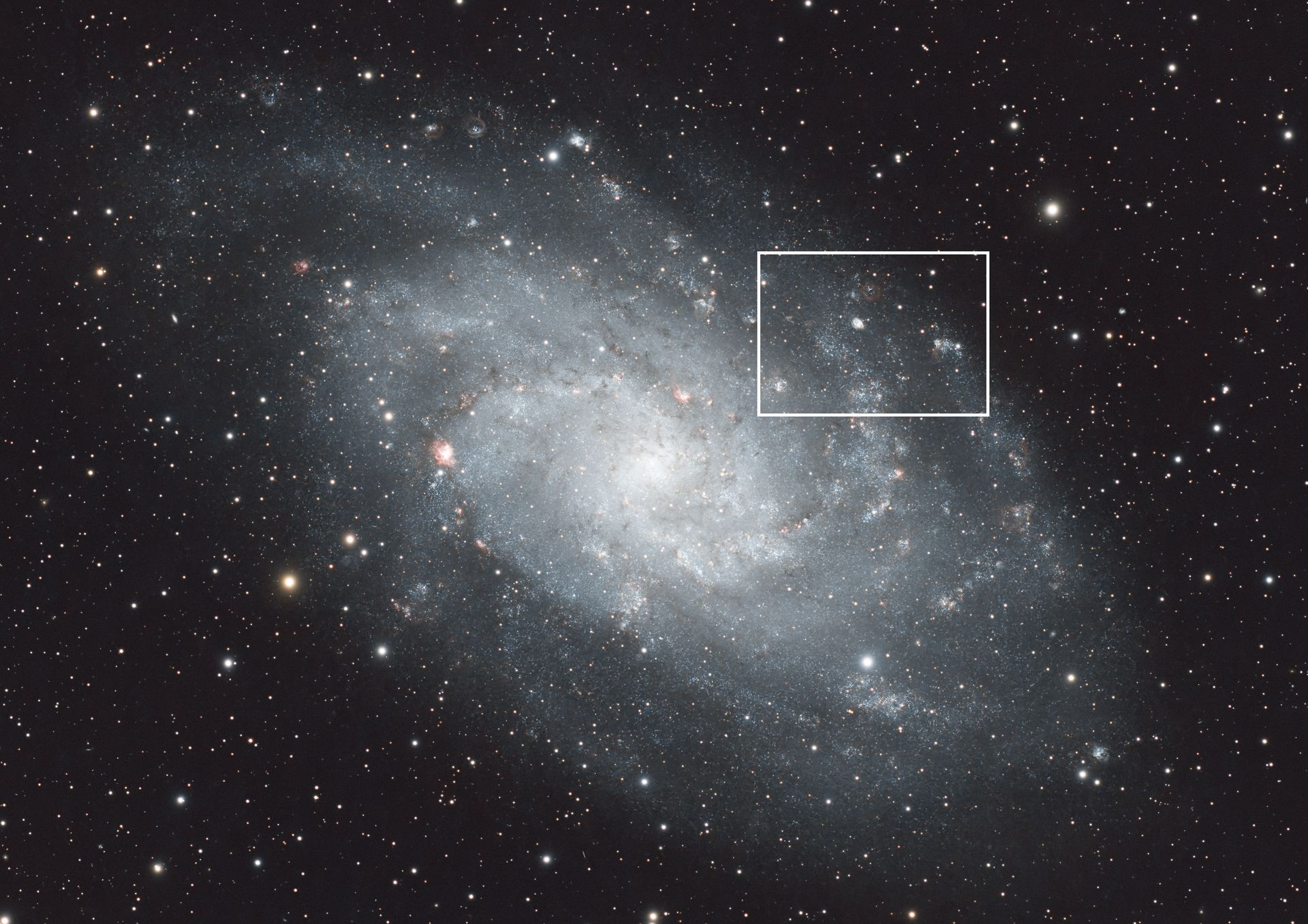 Galassia del Triangolo, meglio nota come M33, è stata ripresa dall'astrofotografo Aleš Ferluga (Centro Studi Astronomici Antares Trieste) sotto l'oscuro cielo del monte Matajur. La ripresa è stata effettuata sia in banda larga (per i colori naturali) che con l'uso di un filtro a banda stretta H-alpha/OIII: combinazione che ha permesso di esaltare non solo la struttura galattica ma la straordinaria risoluzione di alcuni soggetti. In primis, quella delle stelle più luminose che popolano le braccia a spirale di questa galassia.