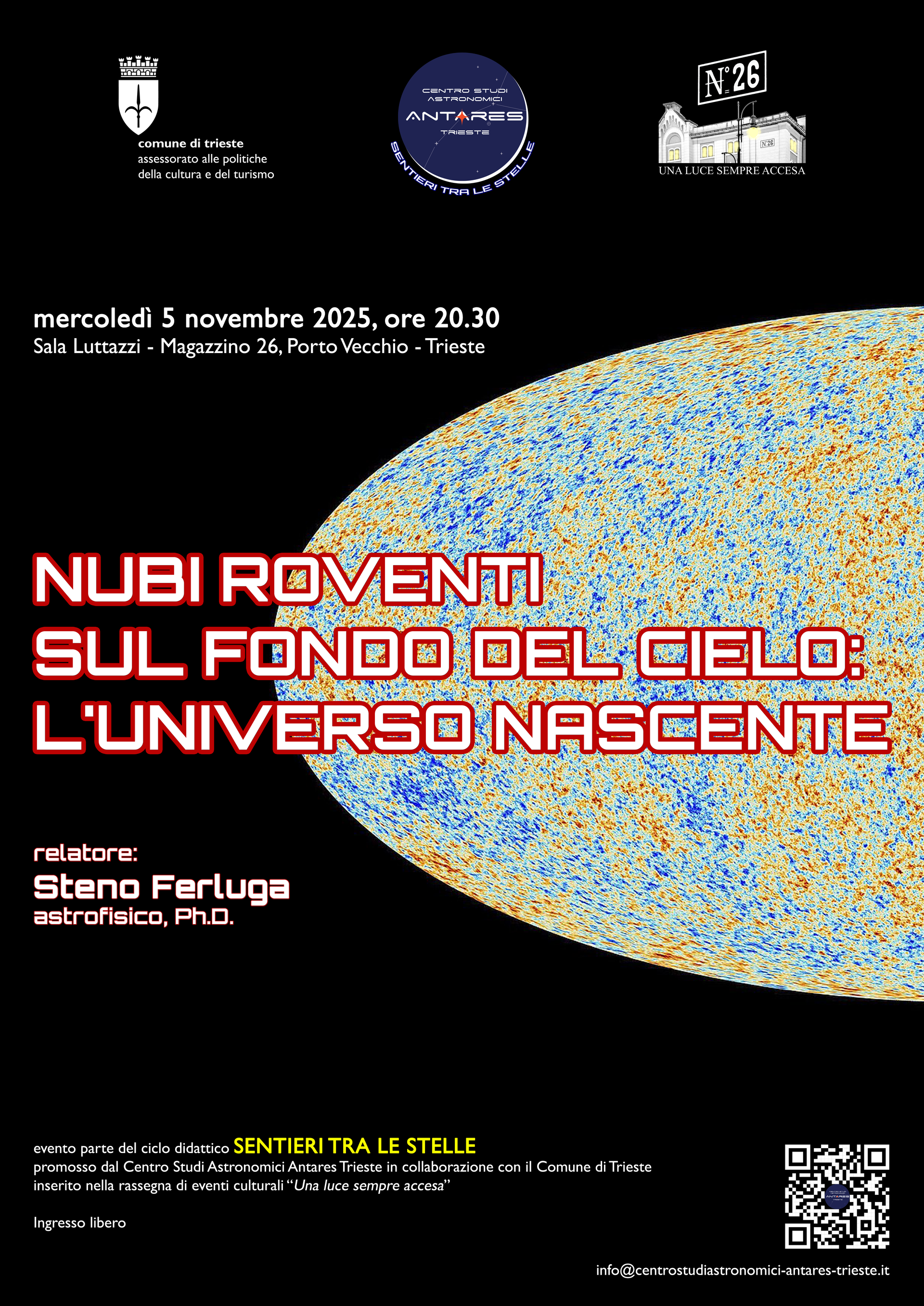 Trieste, città dalla secolare tradizione scientifica, si prepara ad accogliere un viaggio affascinante alle origini del Cosmo. Mercoledì 5 novembre 2025, alle ore 20.30, la prestigiosa Sala Luttazzi (Magazzino 26 in Porto Vecchio a Trieste) ospiterà l'appuntamento inaugurale della serie di incontri divulgativi “SENTIERI TRA LE STELLE”, promossa dal Centro Studi Astronomici Antares Trieste in collaborazione con il Comune di Trieste nell'ambito della rassegna culturale "Una luce sempre accesa". Per questa "data alfa" - che anticipa il ciclo vero e proprio in partenza a gennaio 2026 - l'astrofisico Prof. Steno Ferluga (UniTS) terrà una conferenza dal titolo suggestivo: “NUBI ROVENTI SUL FONDO DEL CIELO: L'UNIVERSO NASCENTE”.