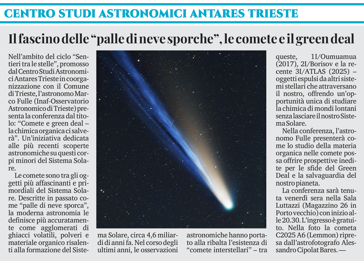 "SENTIERI TRA LE STELLE", APPUNTAMENTO CON LE COMETE: in merito alla conferenza di domani venerdì 9 gennaio, lo storico quotidiano "Il Piccolo" ha pubblicato ieri un articolo di approfondimento che sottolinea l'importanza dell'evento divulgativo "Comete e green deal - la chimica organica ci salverà", promosso dal Centro Studi Astronomici Antares con il Comune di Trieste. L'incontro, che avrà come relatore l'astronomo Marco Fulle (INAF-Osservatorio Astronomico di Trieste), ad ingresso libero, si terrà presso la Sala Luttazzi (Magazzino 26, Porto Vecchio) con inizio alle ore 20.30. La foto ritrae la cometa Lemmon (C/2025 A6) , ripresa dagli oscuri cieli della Valle d'Aosta dall'astrofotografo Alessandro Cipolat Bares (Centro Studi Astronomici Antares Trieste).