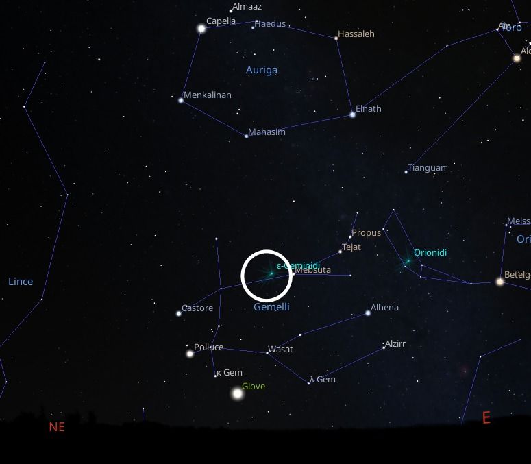 SCIAMI DI METEORE - ε GEMINIDI (023 EGE): iniziano a rendersi visibili a partire dal 14 di ottobre, perdurando indicativamente fino al 27 dello stesso mese. Il massimo cade nella notte del 18 ottobre: oggi, quindi. Si tratta di uno sciame "minore", con ZHR 3.