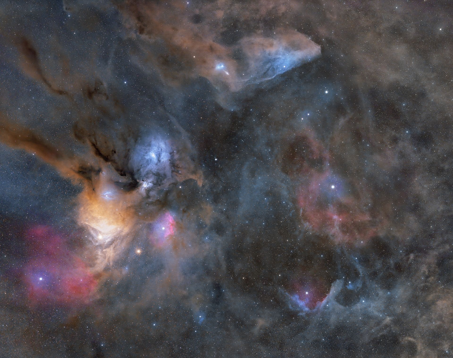 Sullo sfondo, lnello scatto di Orbanic è possibile scorgere ampie aree di idrogeno gassoso che brillano di un rosso delicato grazie all'emissione H-alpha: processo che avviene quando gli elettroni degli atomi di idrogeno decadono dal terzo al secondo livello energetico emettendo fotoni a 656,3 nm. Queste nubi ambrate e brune una solo una piccola porzione del vasto complesso molecolare di Orion, creando un contrasto cromatico e una tridimensionalità che trasformano gli spazi siderali in una tela dinamica dove la luce delle supergiganti dell'associazione Orion OB1 modella e rivela i segreti della polvere interstellare.