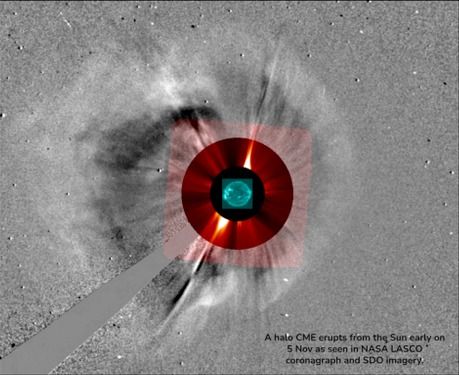 A questo punto importano le CME recenti. Quelle emesse ieri e l'altro ieri, prese singolarmente, dovrebbero provocare rispettivamente una G2 e una G3. Ma la seconda è stata più veloce. In conseguenza si prevede che arriveranno entrambe stanotte o domattina (Nov11/12). Anzi, si prevede che la seconda investa ovvero "cannibalizzi" la prima formando una singola CME che, anche a causa di onde d'urto, sarebbe più potente di entrambe; se questo succede quando investe la Terra, si potrà avere una G4. La CME emessa oggi, invece, è ancora più veloce e potente e si prevede che arrivi domani notte (Nov12/13), causando anch'essa G4. Il tutto potrebbe risultare in una singola G4 (ossia Kp8) prolungata.