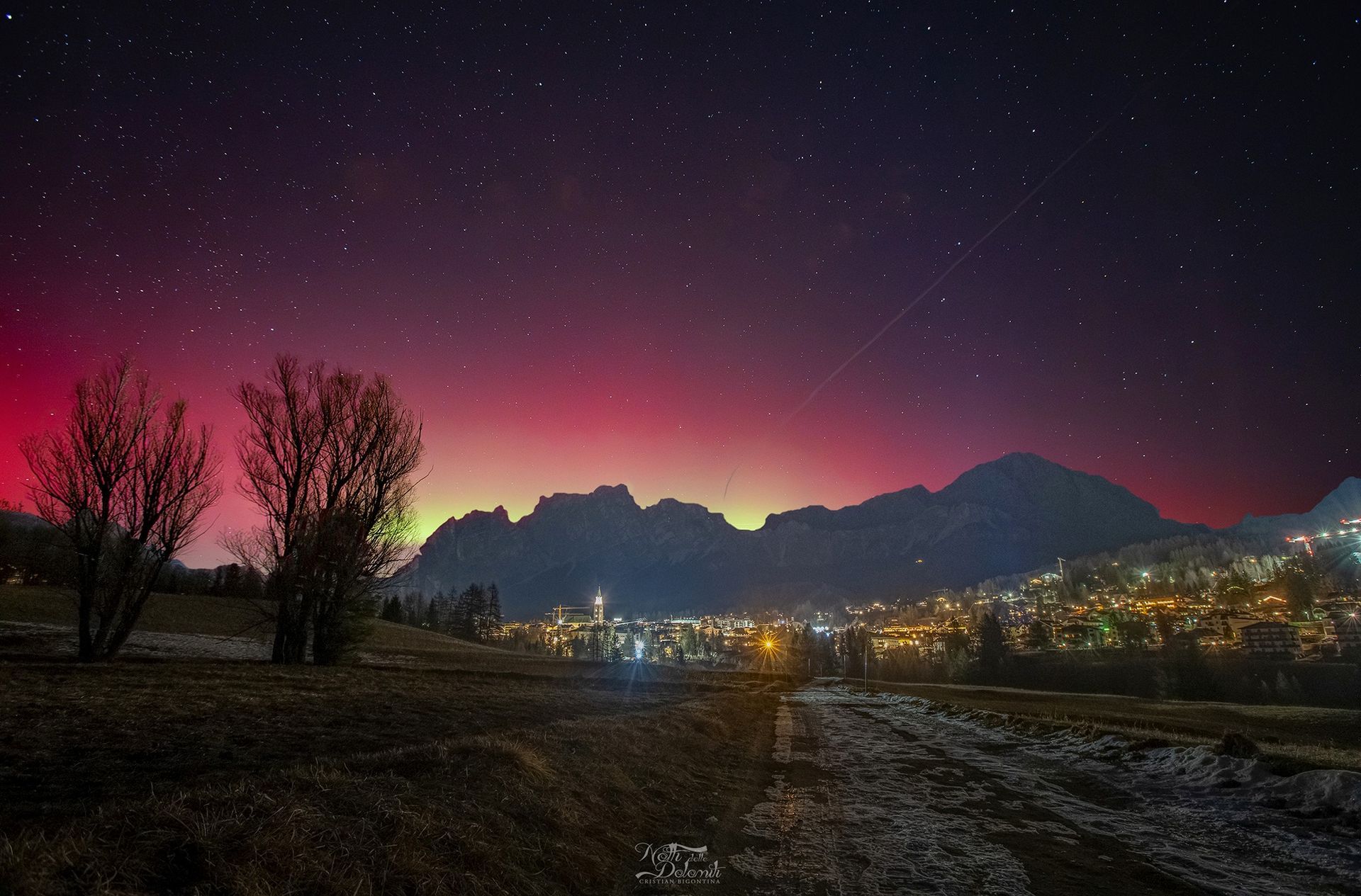 Al di sopra dell'orizzonte settentrionale, il cielo si è tinto dei colori dell'ossigeno atomico, che ha dipinto archi di un rosso profondo nelle zone più alte dell'atmosfera, oltre i 200 km, e vivide scie verde-acquamarina più in basso, tra i 100 e i 200 km.