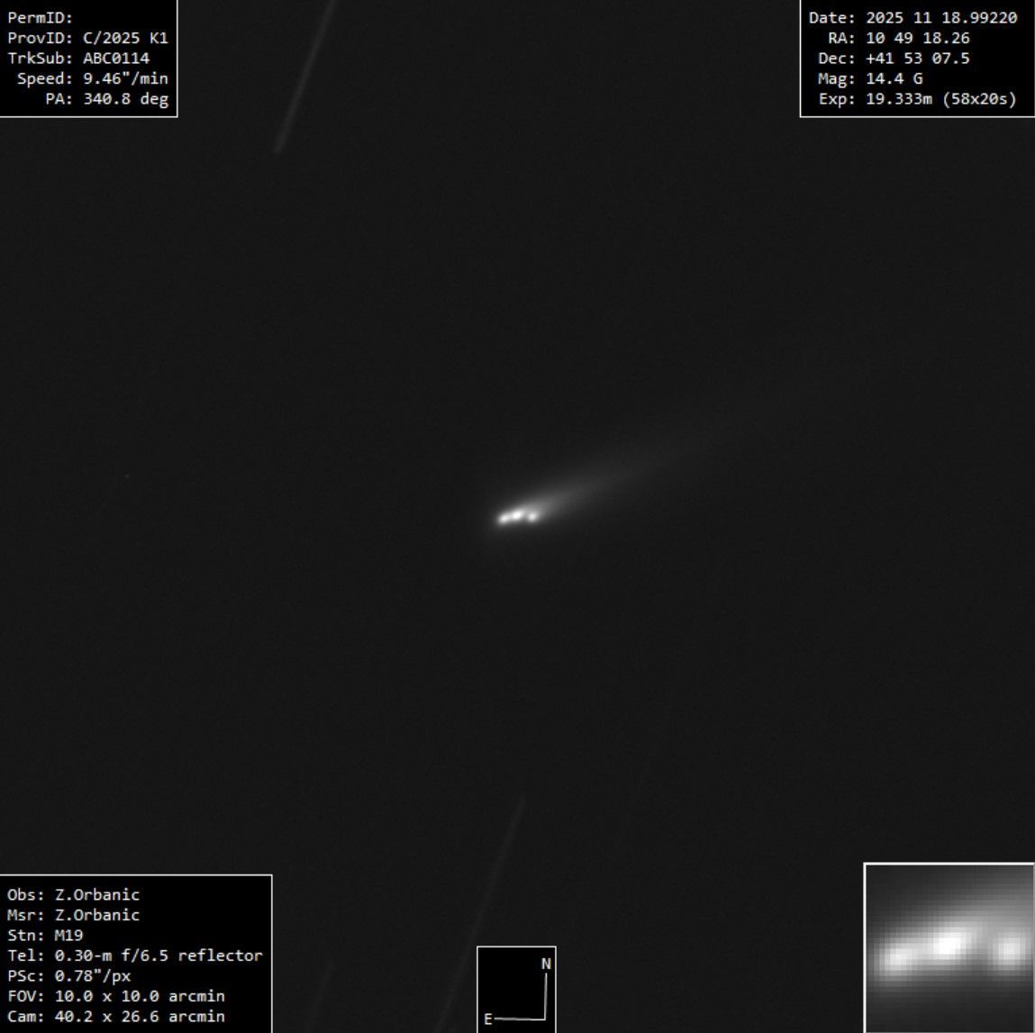 FRAMMENTAZIONE DEL NUCLEO DI C2025 K1 (ATLAS): questa momentanea visitatrice - definita "cometa dorata" a seguito della bassa concentrazione di molecole a base di carbonio (carbonio biatomico, cianuro, monossido di carbonio, ecc.) responsabili della caratteristica luce verdastra delle chiome cometarie, lasciando in tal modo alle polveri il riflesso della luce solare - dopo aver raggiunto il perielio lo scorso 8 ottobre a 0,33 UA dalla stella ha subito una spettacolare frammentazione del suo nucleo, indotto dal calore e dalla pressione dei gas in sublimazione che ne hanno letteralmente squarciato il nucleo di ghiacci e rocce trasformandola in una sorta di "processione" di detriti.