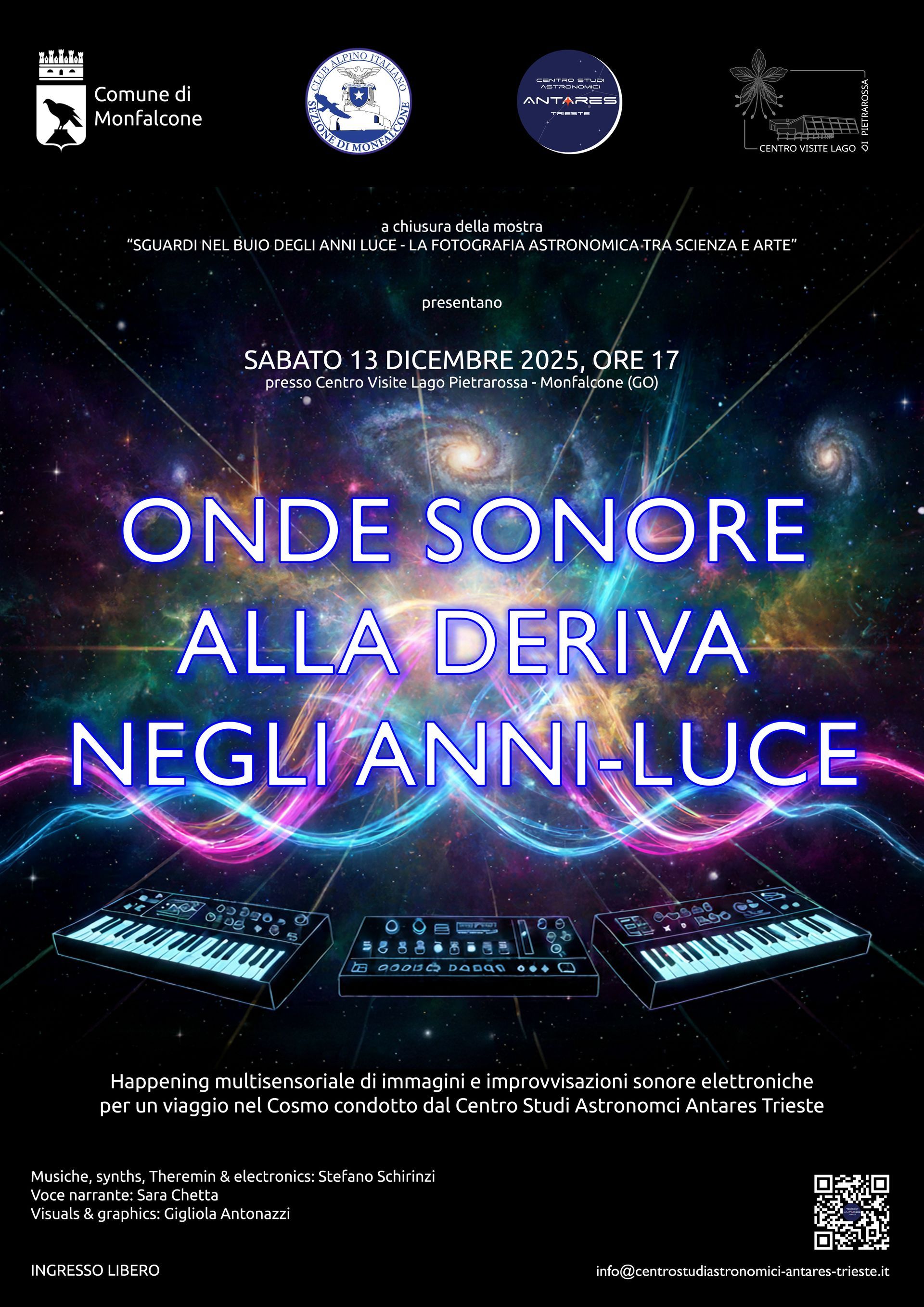 Al termine dell'esplorazione delle emissioni invisibili dell'Universo con la conferenza "RADIOGRAFIE STELLARI", nella giornata di chiusura della mostra "Sguardi nel buio degli anni-luce - la Fotografia Astronomica tra Scienza e Arte", il Centro Visite Lago di Pietrarossa a Monfalcone (GO) si trasformerà in un auditorium cosmico ospitando "ONDE SONORE ALLA DERIVA NEGLI ANNI-LUCE", un'esperienza multisensoriale immersiva ideata quale ponte ideale per superare il buio degli anni-luce.