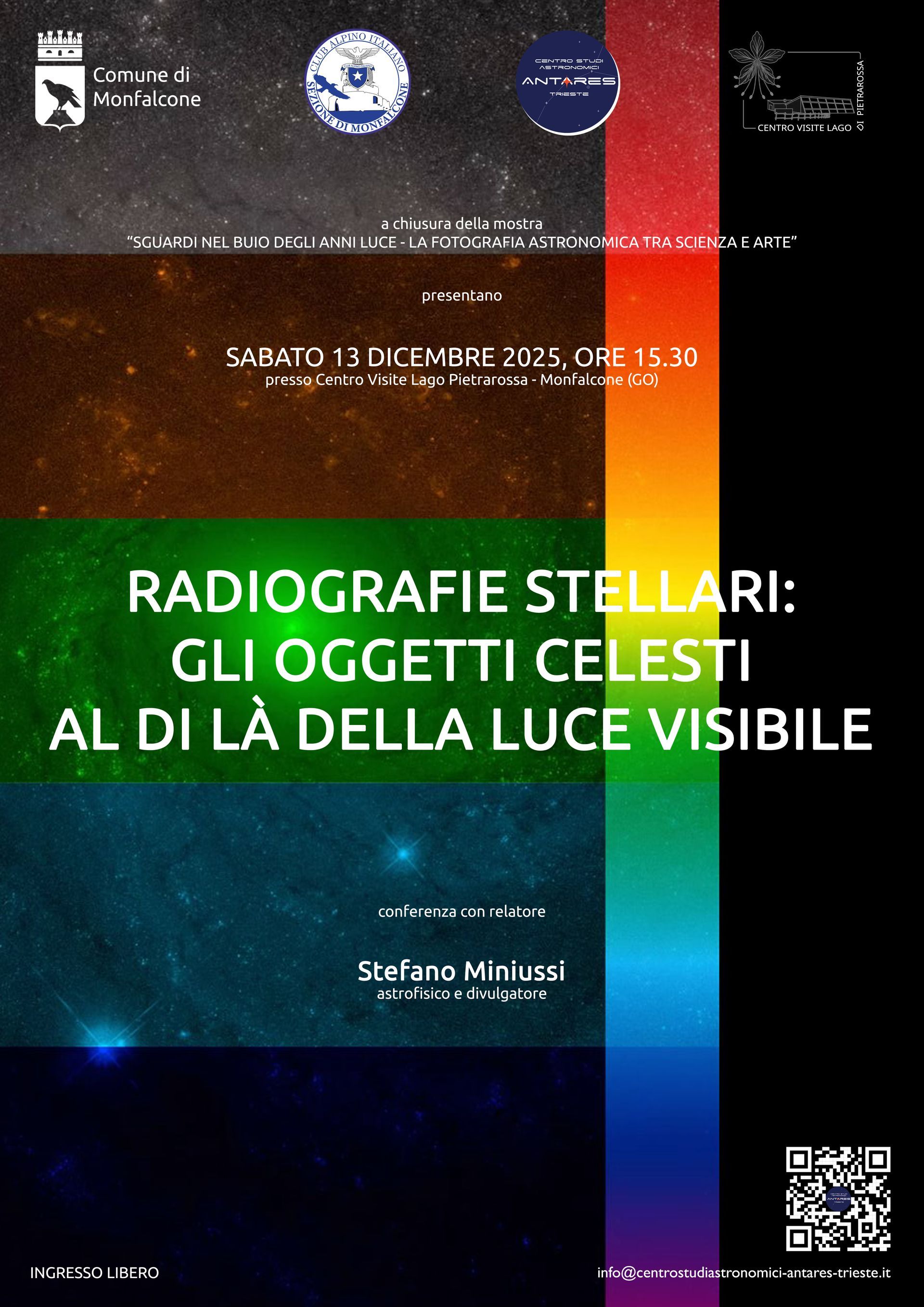 Per la chiusura della mostra, Sabato 13 dicembre alle ore 15.30 si terrà la conferenza, "Radiografie stellari: gli oggetti celesti al di la della luce visibile", con relatore l’astrofisico Stefano Miniussi (CAI Monfalcone), al termine della quale seguirà "Onde sonore alla deriva negli anni-luce", spettacolo multimediale di superbe immagini dello spazio profondo e musica elettronica a cura del fisico e Presidente del Centro Studi Astronomici Antares Trieste Stefano Schirinzi.