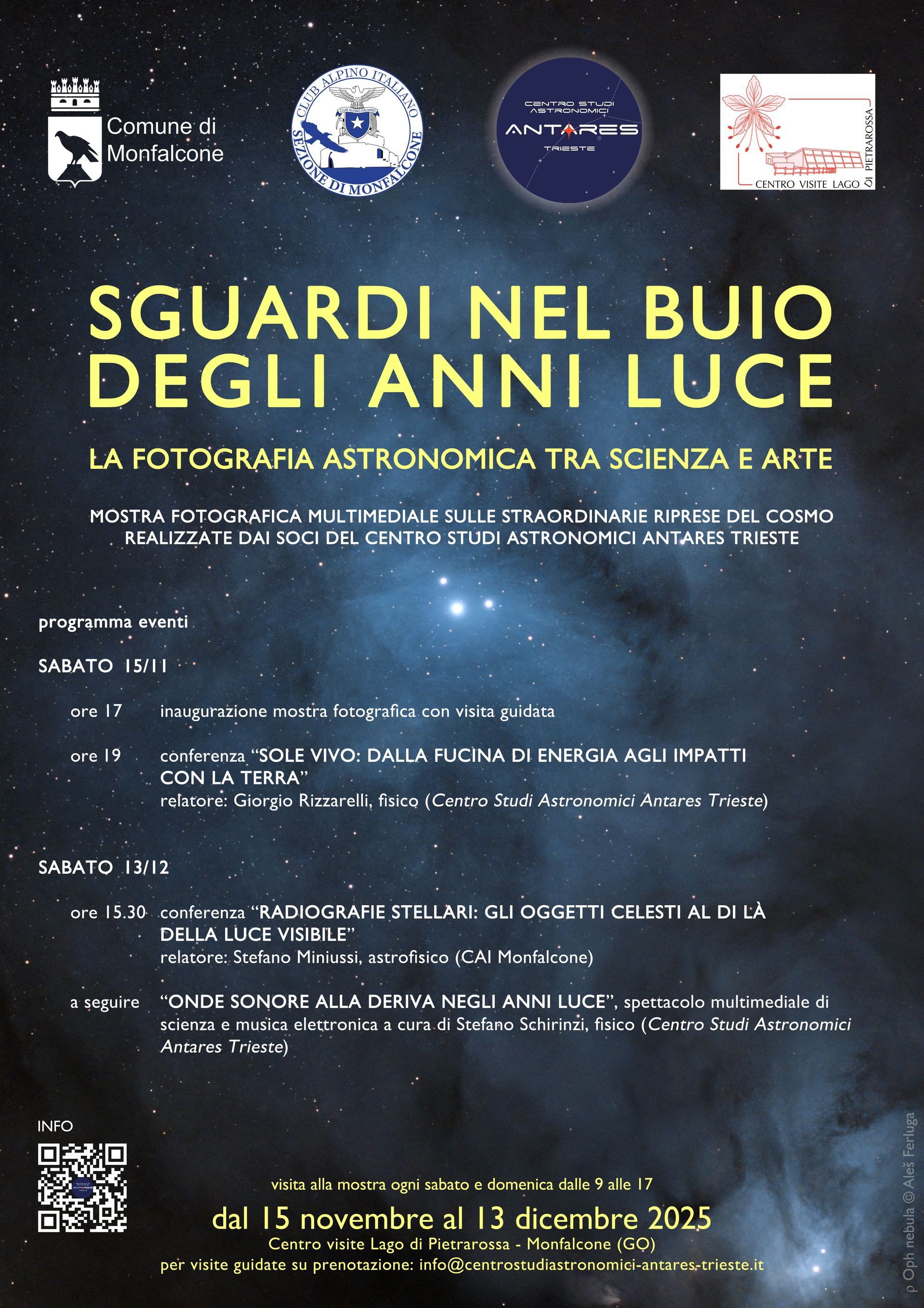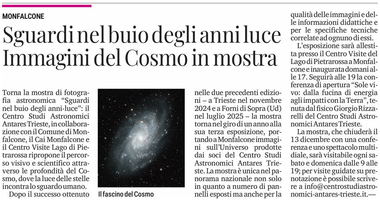 TORNA LA MOSTRA DI FOTOGRAFIA ASTRONOMICA "SGUARDI NEL BUIO DEGLI ANNI-LUCE": il Centro Studi Astronomici Antares Trieste, in collaborazione con il Comune di Monfalcone, il CAI Monfalcone e il Centro Visite Lago di Pietrarossa torna riproporre la mostra di fotografia astronomica "SGUARDI NEL BUIO DEGLI ANNI LUCE", percorso visivo e scientifico attraverso le profondità del Cosmo, dove la luce delle stelle incontra lo sguardo umano.