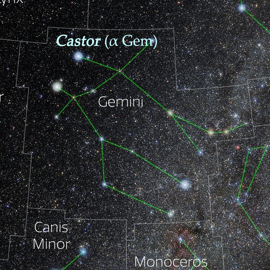 VIAGGIO TRA LE STELLE - CASTOR: Castor e Pollux, i gemelli celesti visibili nelle notti invernali. Anche se a prima vista le due stelle di Gemini sembrano simili in luminosità, ad un’osservazione più attenta l’arancione Pollux (β Gem), la più meridionale dei due, appare leggermente più luminosa della bianco-azzurrina Castor (α Gem), situata subito a nord