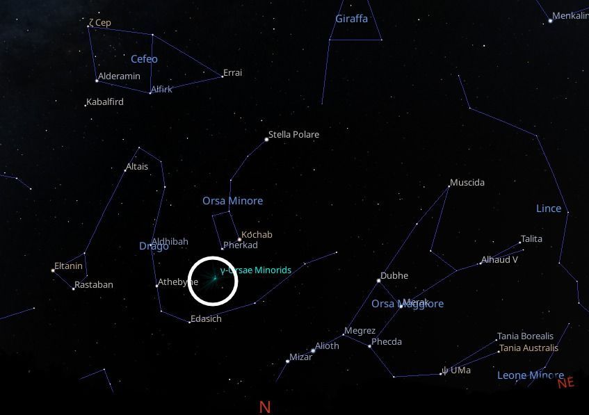 Tra questi rientrano certamente le γ-Ursae Minoridi, che si rendono visibili generalmente dal 15 al 25 di gennaio, raggiungendo il massimo nella notte del 18 gennaio con ZHR 3. Si tratta di meteore di bassa velocità (entrata nell’atmosfera stimata in circa 31 km/s). Il radiante è situato non lontano dalla stella Pherkad (γ Ursae Minoris); essendo il radiante circumpolare, le meteore sono quindi visibili per tutta la notte. Quest’anno lo sciame coincide con una fase di Luna nuova, agevolando l’osservazione.