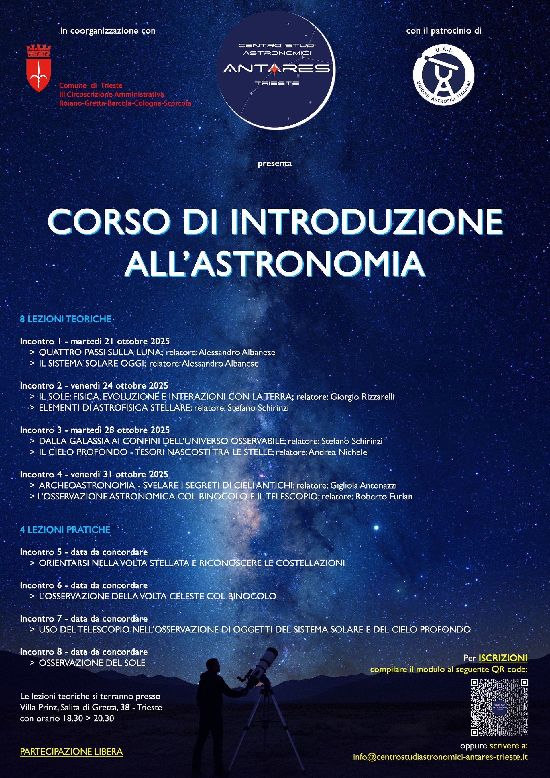 Per gli appassionati di astronomia a Trieste e dintorni che cercano di approfondire la propria curiosità nel vasto campo dell'astronomia con il pieno supporto di un team di astronomi ed esperti del settore, il Centro Studi Astronomici Antares Trieste offre l'opportunità di esplorare il Cosmo attraverso il nuovo "CORSO DI INTRODUZIONE ALL’ASTRONOMIA": un viaggio stellare completo, intensivo e totalmente gratuito, in partenza Martedì 21 ottobre 2025!