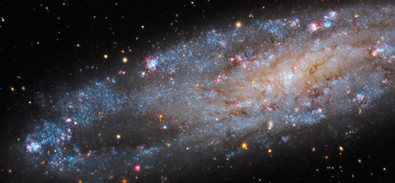 Situata in Sculptor, IC5332 è una bellissima e luminosa galassia a spirale vista esattamente di fronte, lontana circa 30 milioni di anni-luce dalla nostra. Sorprendenti dettagli erano stati già messi in evidenza dalla splendida immagine (a sx) ripresa dalla camera Wide Field 3 installata sul telescopio spaziale Hubble (NASA/ESA): tale strumento, oltre a produrre immagini eccellenti nel visibile, estende la propria capacità nel riprendere anche il vicino UV e il vicino IR. Nella ripresa di HST, si rende visibile la netta differenziazione tra stelle giovani, presenti nel disco della galassia, e quelle vecchie, risiedenti nella regione centrale della galassia e nel suo alone; ben discernibili anche le numeroso associazioni OB, composte da luminosissime e caldissime stelle azzurre nate da densi apparati nebulari sparse nelle braccia a spirale. IC5332 è stata ripresa anche da James Webb Space Telescope attraverso la camera MIRI (Mid-Infrared Instrument), che osserva nel medio infrarosso tra 5 µm e 28 µm. Il medio infrarosso è incredibilmente difficile da osservare dalla Terra poiché gran parte di queste lunghezze d'onda viene assorbito dall'atmosfera terrestre ( ...e il calore della stessa atmosfera terrestre complica ulteriormente le cose ): mentre Hubble non ha potuto osservare nel medio infrarosso in quanto i suoi specchi non erano abbastanza freddi, MIRI dispone di un sistema di raffreddamento atto a garantire che i suoi rivelatori siano costantemente mantenuti alla temperatura di -266° C ovvero solo 7 K al di sopra dello 0 assoluto. Nette ed immediatamente evidenti sono le differenze tra queste due immagini riprese nello stesso soggetto. Mentre in quella di HST (a sx) regioni scure sembrano separare le braccia a spirale della galassia, l'immagine di JWST (a dx) mostra un enorme groviglio dovuto alla grande quantità di polveri presenti in tali strutture, ricalcandone la forma; la polvere interstellare, infatti, non disperde luce infrarossa e si rende qui ben visibile. Prestando attenzione, è possibile notare come tali polveri circondino un fittissimo numero di aree circolari, simili a buchi: si tratta, probabilmente, di aree dove la polvere è stata radialmente spazzata, addensandosi ai bordi di tali bolle, dall'esplosione di supernovae e ipernovae. (Image credits: ESA/Webb, NASA & CSA, J. Lee and the PHANGS-JWST and PHANGS-HST Teams)