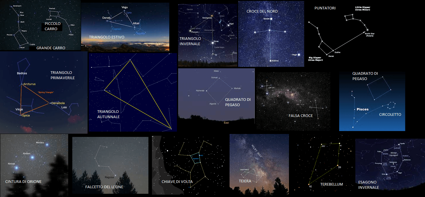 Un "ASTERISMO" è un gruppo di stelle riconoscibile nella volta stellata per la sua particolare configurazione geometrica (triangolo, linea, poligono, ecc.), rendendosi utile quale riferimento per l'individuazione di costellazioni ed oggetti celesti. Un asterismo può essere parte di una costellazione, coincidere con un'intera costellazione (nell'unico caso del “piccolo carro”, che è nulla di più che la stessa costellazione Ursa Minor) e raggruppare stelle - più o meno luminose - appartenenti anche a costellazioni diverse.